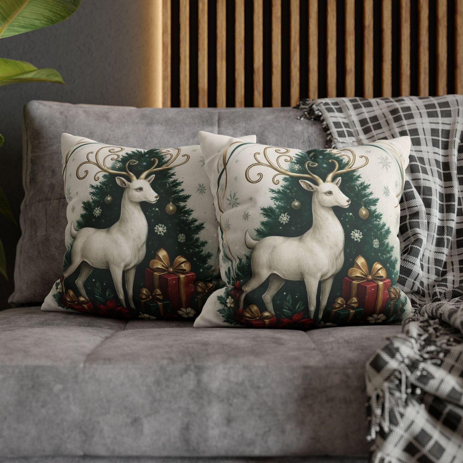 Christmas Reindeer Pillowcase – Festive White Deer & Tree Square Throw Pillow Cover 16" × 16"