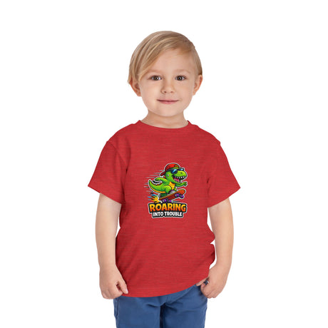 Toddler Tee — "Roaring Into Trouble" Dinosaur Graphic Shirt