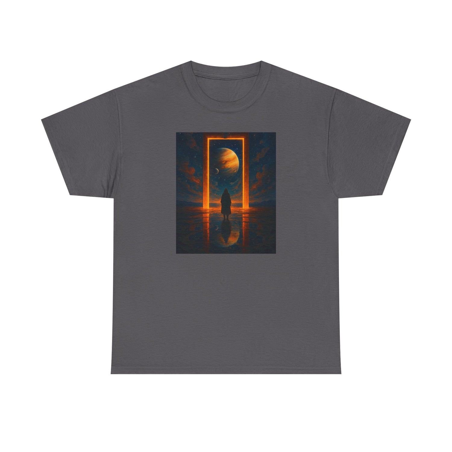 Surreal Portal Moon Tee — Orange Cosmic Gateway Graphic T-Shirt - Charcoal / S is backordered and will ship as soon as it is back in stock.