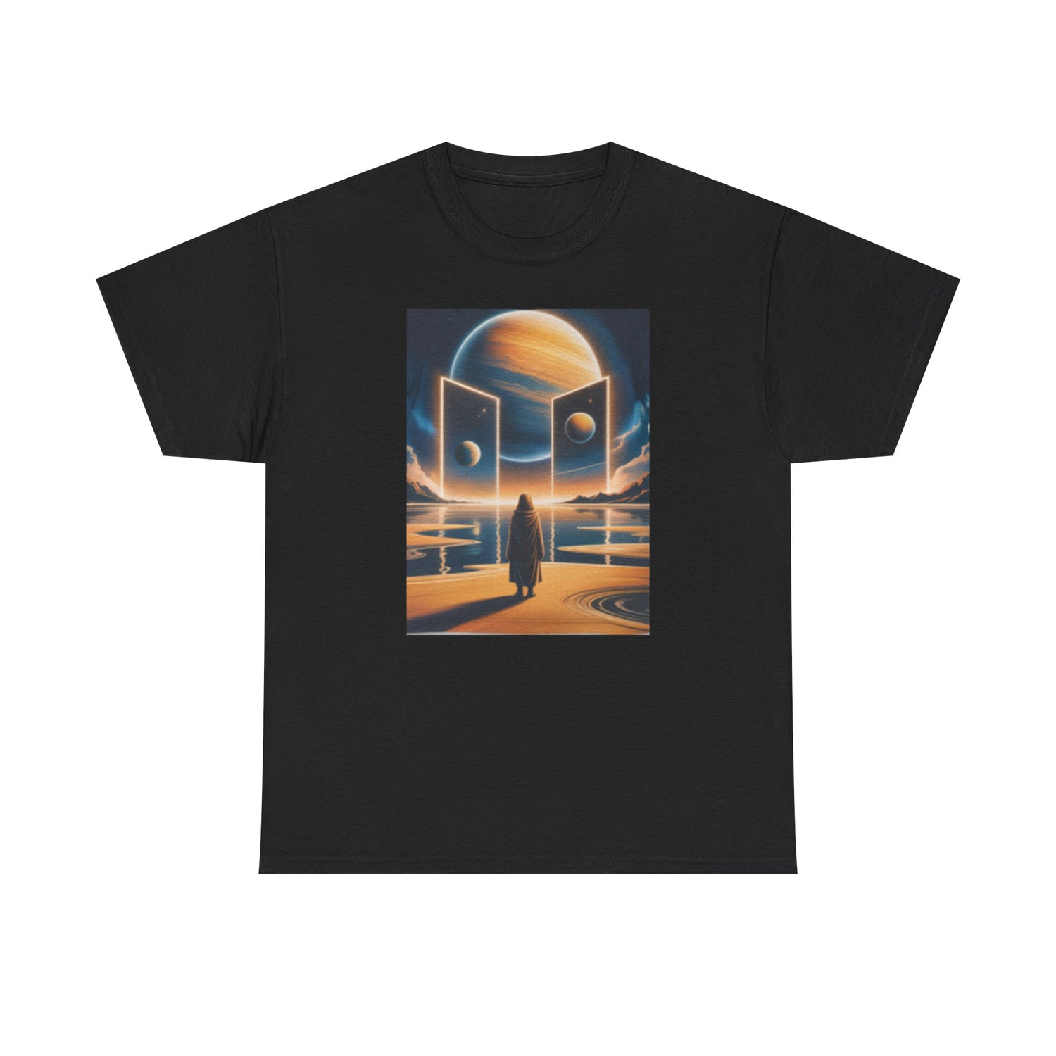 Step through a doorway into a silent, sunlit cosmos. This tee carries an artful sci‑fi scene — a lone figure standing before towering portals, warm light spilling across alien terrain beneath a ringed planet. The image reads like a quiet moment of decision: curiosity, calm resolve, and the soft thrill of exploration. The classic crew neck and structured shoulder tape keep the silhouette neat, while the smooth, strong cotton gives the print a crisp, tactile presence. Wear it on city nights when you want to feel like you belong to a wider sky, during gallery visits, or layered under a jacket for relaxed weekend wanderings.