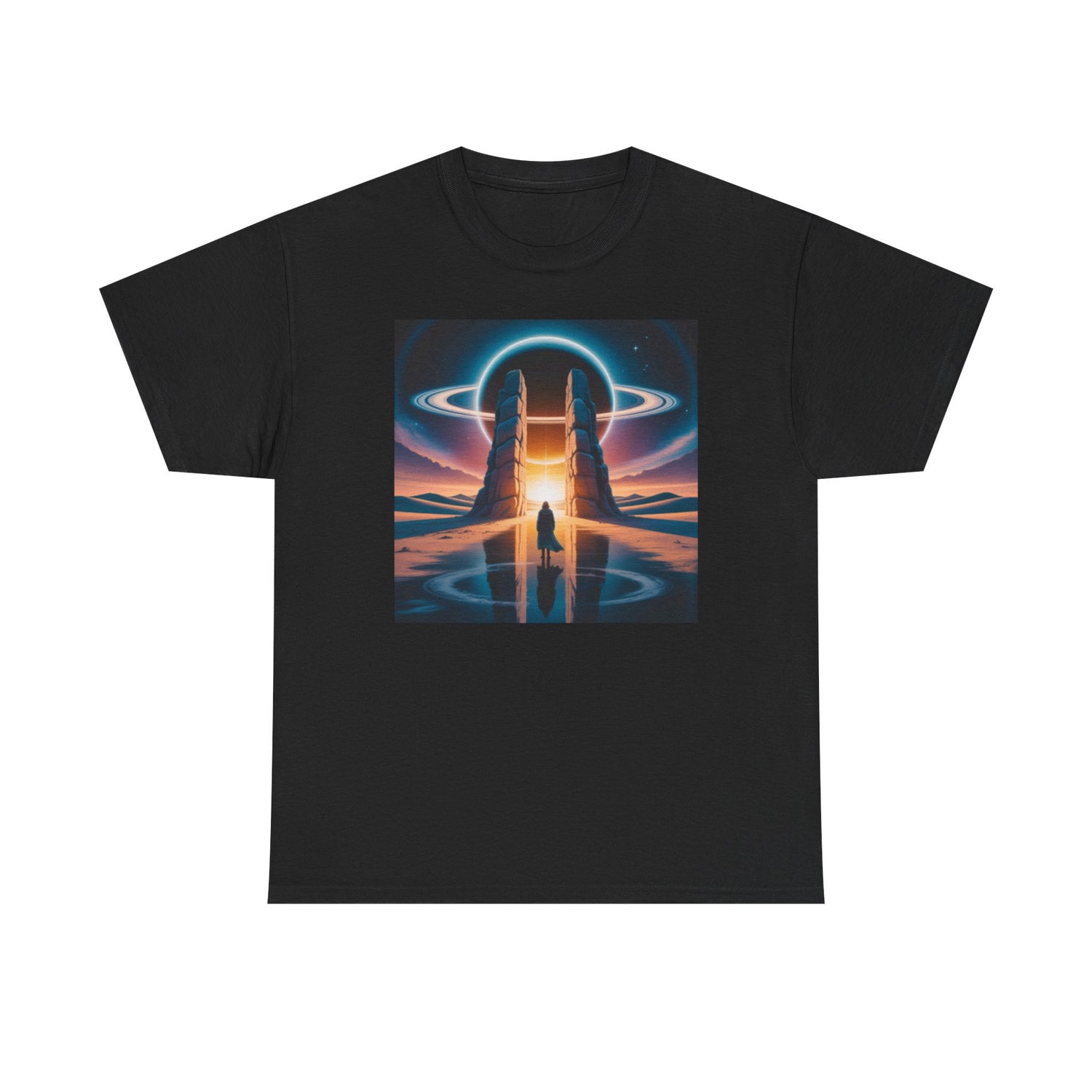 Walk toward something vast and strange. This soft, sturdy tee wears a vivid sci‑fi scene across the chest: a lone traveler approaching a glowing portal ringed by planets and reflected in still water. It’s the sort of shirt that feels like a bookmark for daydreams — easy to throw on for long drives, late‑night meetups, or gallery nights when you want your outfit to tell a story without saying a word. The medium‑weight cotton holds color well, the ribbed collar keeps its shape, and the tactile feel stays smooth wash after wash. Wear it when you’re chasing sunsets, planning your next tabletop campaign, or standing beneath city lights and imagining other worlds.