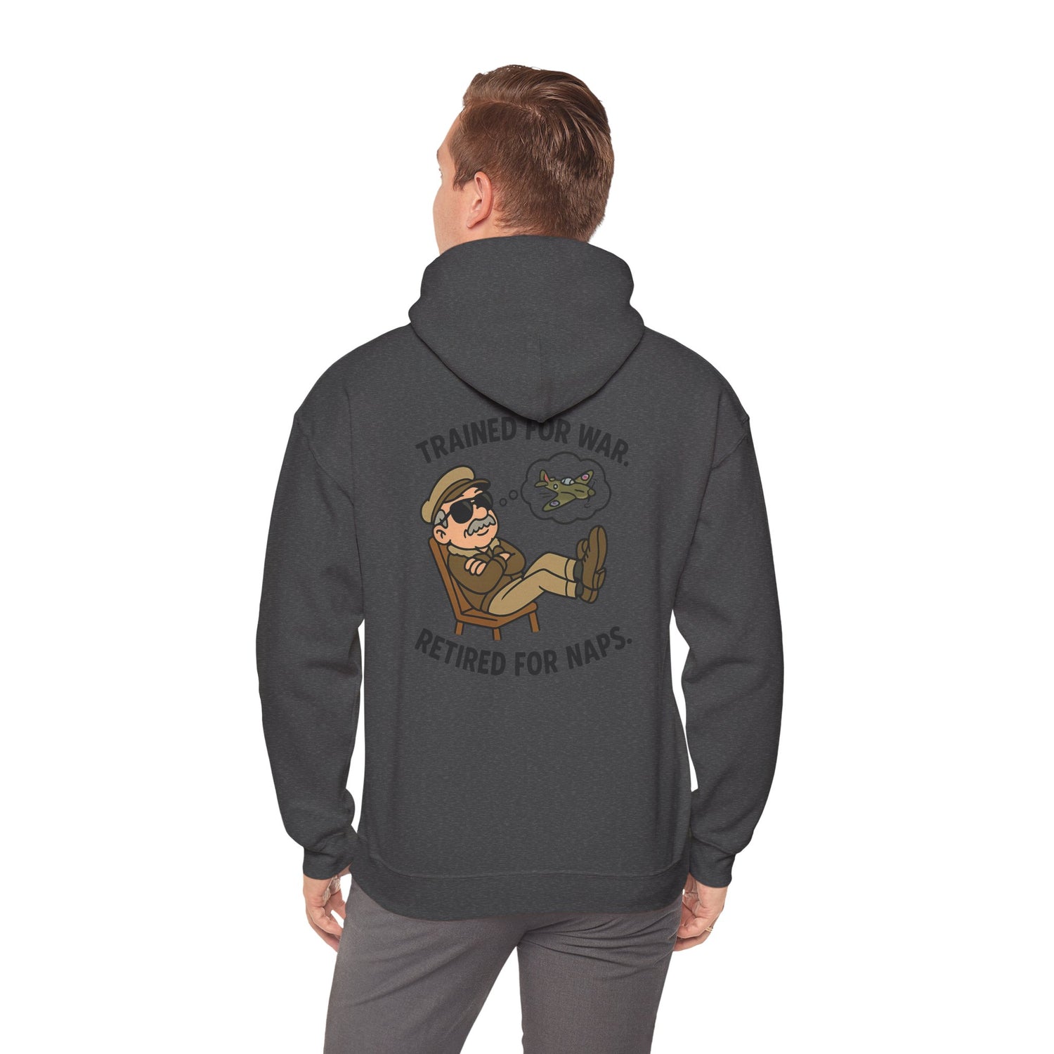 Retired Pilot Hooded Sweatshirt — "Trained for War, Retired for Naps" - Dark Heather / S is backordered and will ship as soon as it is back in stock.