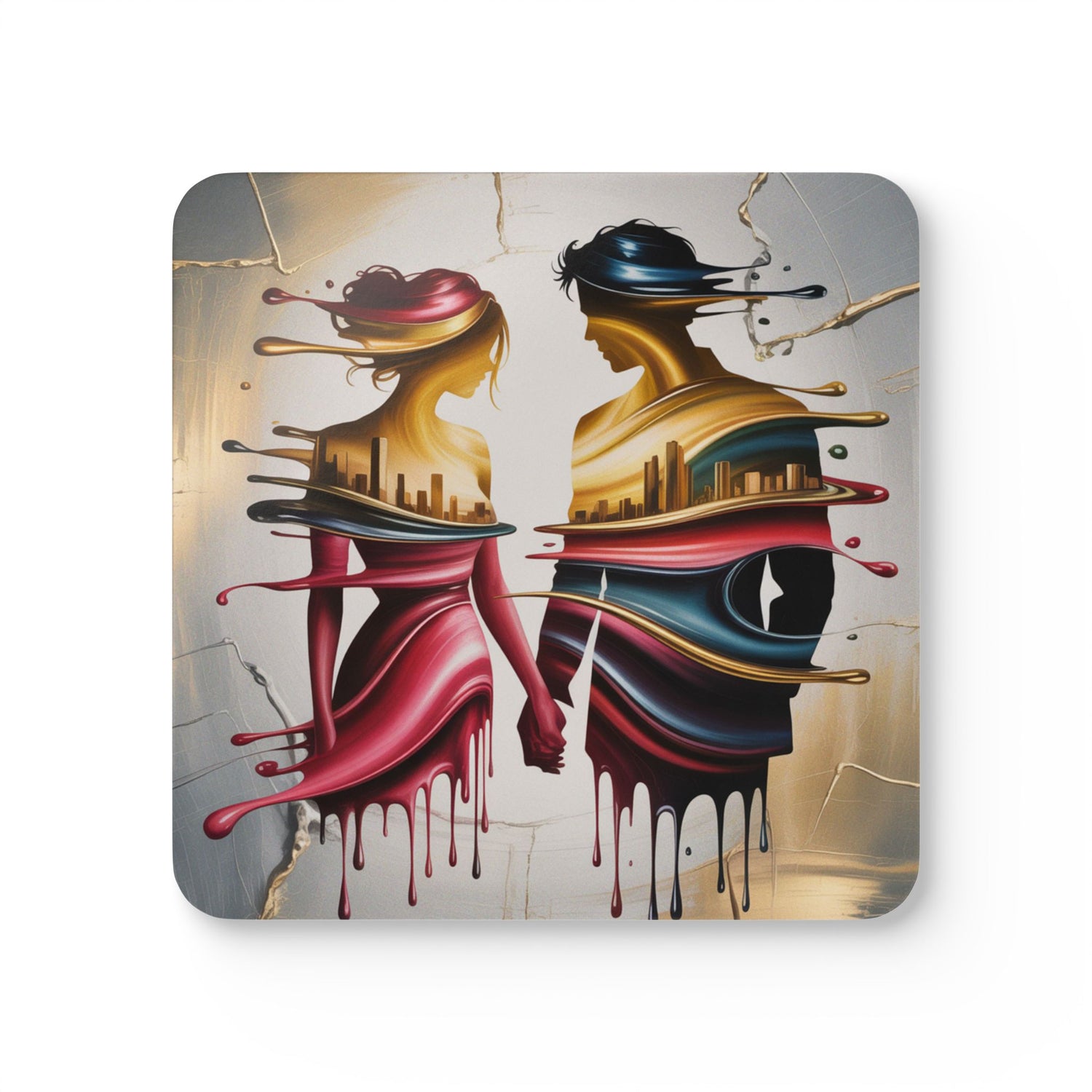 Abstract Couples Cork Coaster Set — Romantic Drip Art Drink Coasters