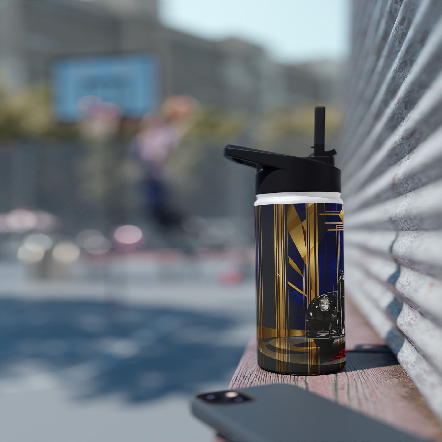 A sleek stainless steel bottle wrapped in bold, vintage-glam artwork that carries your drink and a story. The matte, grainy finish feels grounded in the hand while the high-contrast print — a red-gowned figure beside a classic automobile beneath an Art Deco chandelier — brings cinematic flair to your daily routine. Double-wall insulation keeps coffee warm through morning meetings and iced tea crisp on long drives. Lightweight and sturdy, it slips into a bag or cup holder and stands up to daily use with a twist-on BPA-free lid. This bottle suits anyone who loves nostalgia, film-noir style, and functional design that sparks conversation.