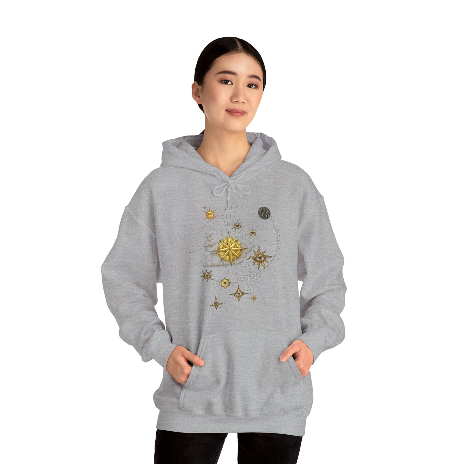 Celestial Compass Hoodie — Gold Star & Sun Astronomy Graphic