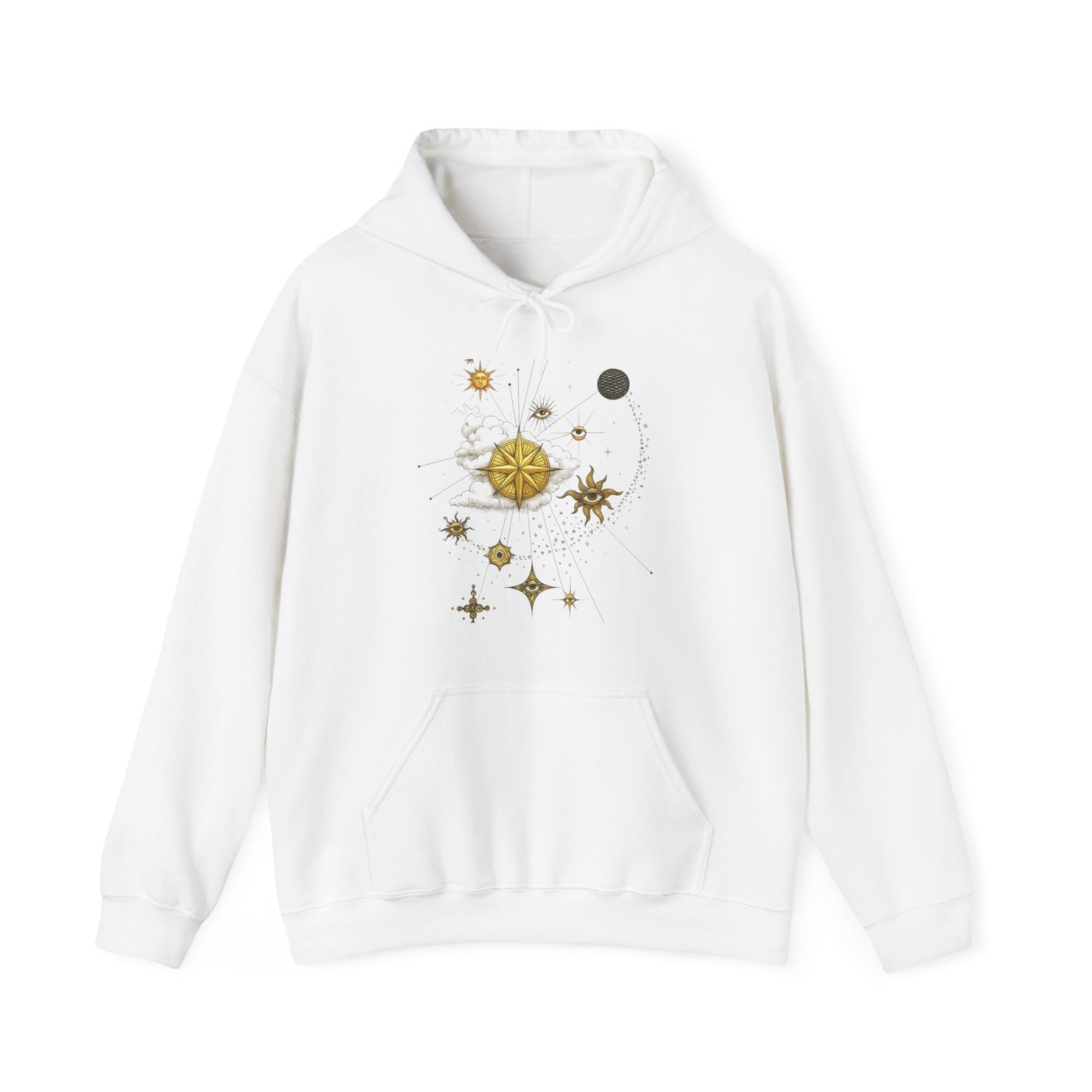 Celestial Compass Hoodie featuring a gold star and sun astronomy graphic showcased in a bright white background.