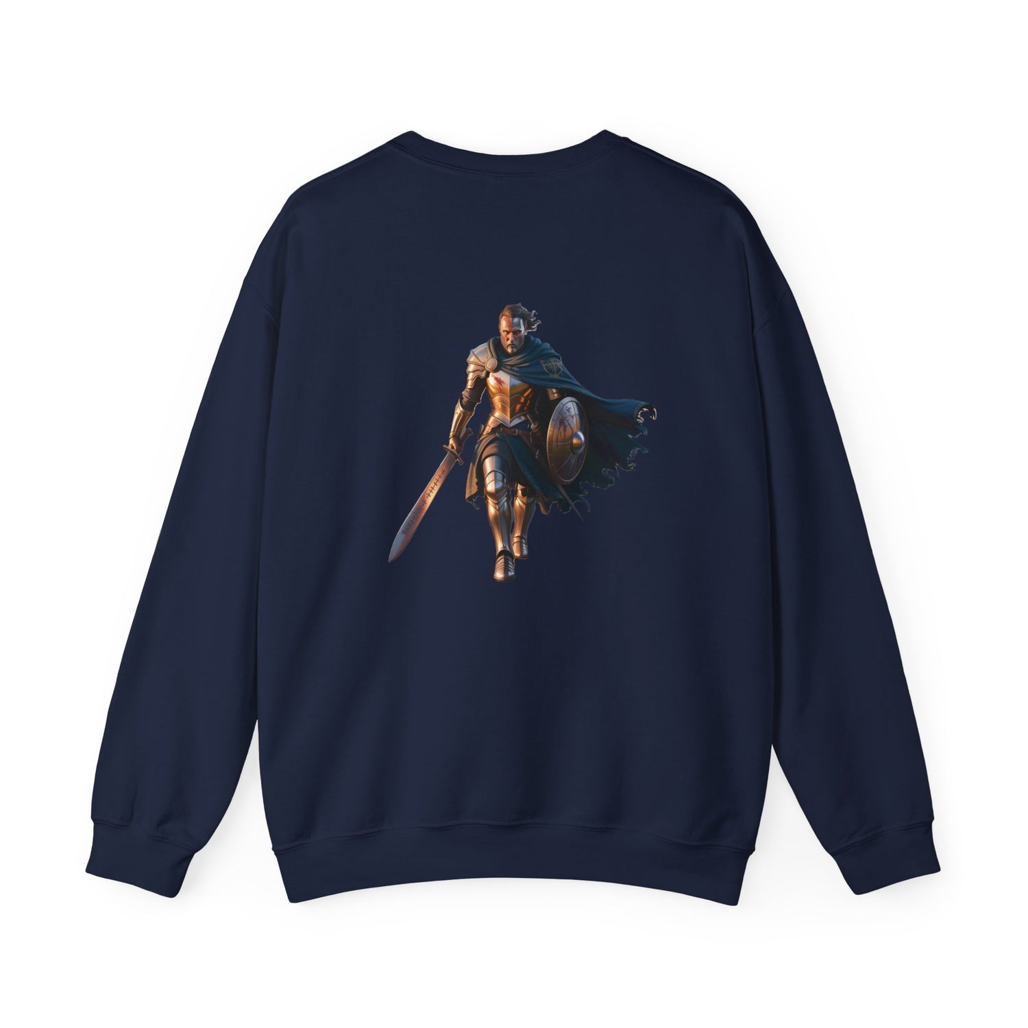 A soft, mid-weight crewneck sweatshirt that feels like wearing a quiet promise of adventure. The front carries a small, embroidered eagle in flight—compact and subtle—while the back reveals a bold, cinematic warrior descending through shadow and light. Wear it when you want comfort that still tells a story: mornings wrapped in coffee and maps, late-night gaming sessions with friends, or layered under a coat on a chill walk. The fabric drapes cleanly without side seams, the collar bounces back after wear, and the tear-away neck label keeps the inside smooth against the skin. Thoughtful construction and OEKO-TEX–certified dyes mean the piece ages with character, not fuss. This sweatshirt sits in the intersection of rugged fantasy and everyday ease—quiet enough for daily wear, expressive enough for moments when you want your style to speak.